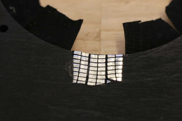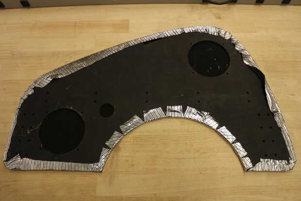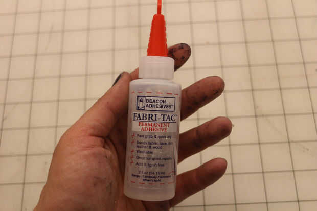 Fabri-Tac es impresionante, aunque un poco desordenado. Para uso futuro, sugiero guantes. Pegué los lados sobre los bordes del borde de corte del panel. Corté las rajas en la tela para hacer más fácil virar hacia abajo alrededor de curvas y curvas.