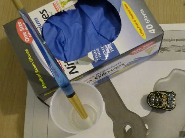 4. usando un lado sello cepillo desechable. En la parte trasera, evite cualquier epoxi en el interruptor y el USB. Todo lo demás puede ser cubierto con epoxi y seguir trabajando, incluso los diodos de la foto.