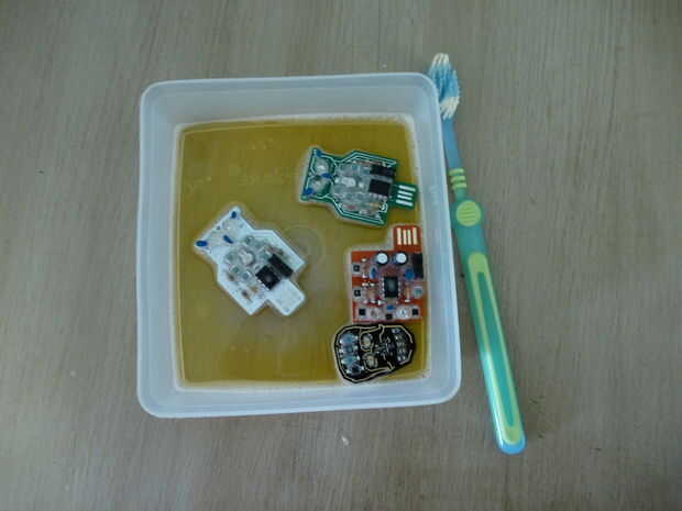b. recomendamos diluir naranja limpia y un cepillo de dientes para eliminar todo el flujo. Cepíllelo bien.