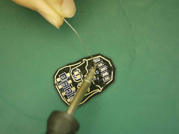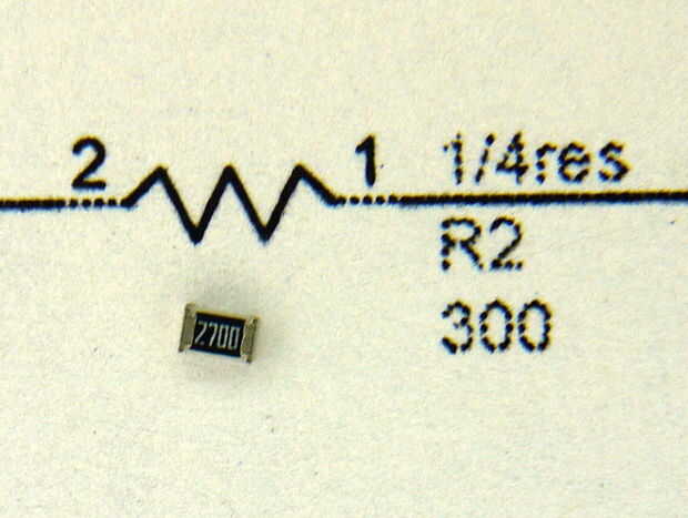 A continuación la final del diente de la sonrisa, R1 en el compartimiento de sábado. Repita los mismos pasos: un cojín de la soldadura, un lado de la resistencia de la soldadura, soldadura pad restantes.