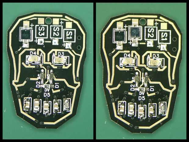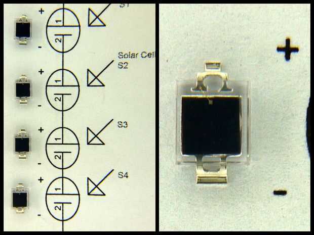 Último paso para Rev 5 en la parte superior son los fotodiodos (las células solares mini). Están sueltos en la bolsa, debe tener 4 de ellos. También es importante la orientación de los diodos de la foto. Hay un pequeño punto de plata en uno de los extremos que indica el positivo. Comprobar con nuestras fotografías si no está seguro. La soldadura en las células solares S1 a S4. Tenga en cuenta que la orientación cambia en S2 y S4, la plata punto hacia la parte inferior del tablero.