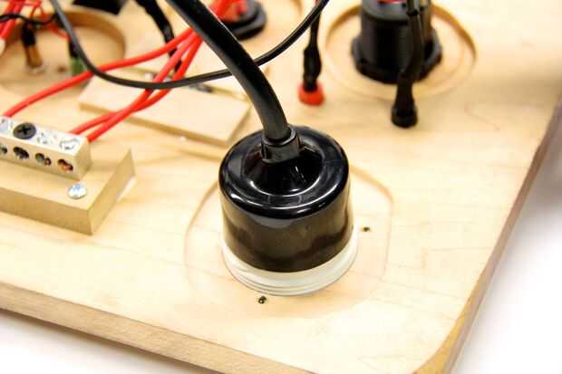 Conecte los cables que se extendieron desde el cargador de batería 12V hackeado ladrillo estilo a un LED de 12V naranja y verde que son montados en el panel para indicar el estado de carga.
