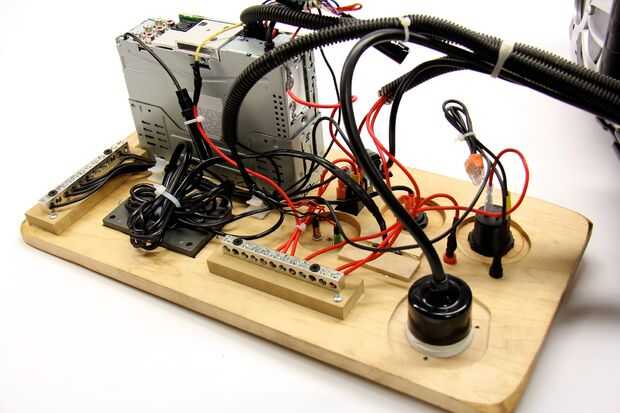 Conexiones de la soldadura en su caso. Espada de uso tapones en interruptores y contactos altavoz. Utilice cinta eléctrica o del encogimiento del calor-tubos (mejor) en todas las conexiones expuestas. Usé algunos simples tres vías conectores para extender o rama de los cables en áreas demasiado lejos de la barra, donde no quería correr otra alambre la parte posterior (se muestra en los enchufes de barril de encendedor de cigarrillos en las fotos de abajo).
