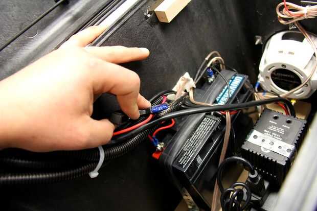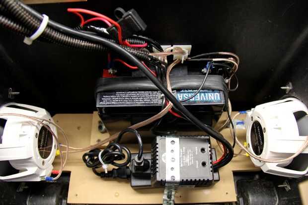 Tomar el paquete de cables que vienen desde el panel de control y conecte a sus lugares respectivos en los terminales de la batería, fuente de alimentación y cargador de pared. Utilicé cable clips, abrazaderas de plástico y zip tie soportes adhesivos para gestionar todos los cables lo mejor posible por lo que no era un nido de ratas dentro de la caja.