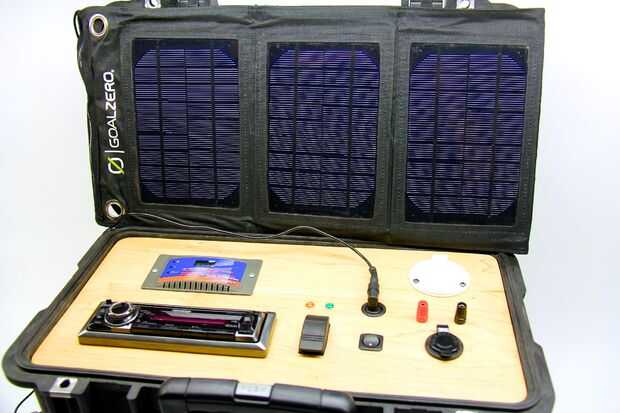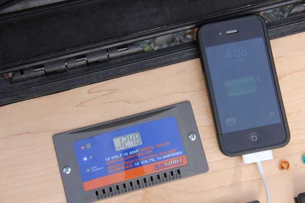 Si el panel está a pleno sol, verá el aumento de la tensión de la batería. Si usted comienza a jugar el equipo de música, debería ver el voltaje de la batería lentamente caer. Más fuerte será el equipo de música, debe caer más rápido la tensión de la batería. A pleno sol y bajo condiciones normales de juego encontré la tensión permanezca constante durante varias horas.