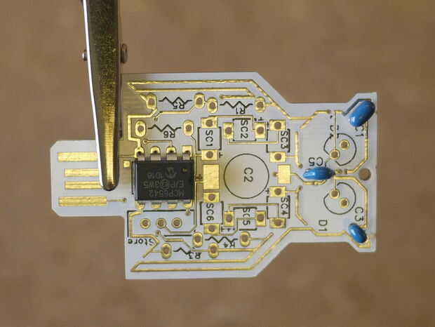 Línea de la viruta en el tablero, U1. El recorte en la viruta debe coincidir con la Plaza sobre la huella de chip board. Se puede ver en la imagen. Que tenga que apretar las puntas a cada lado para conseguirlo a presión en.