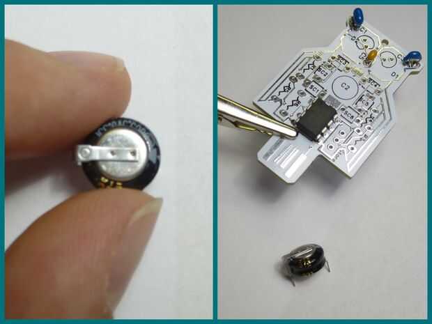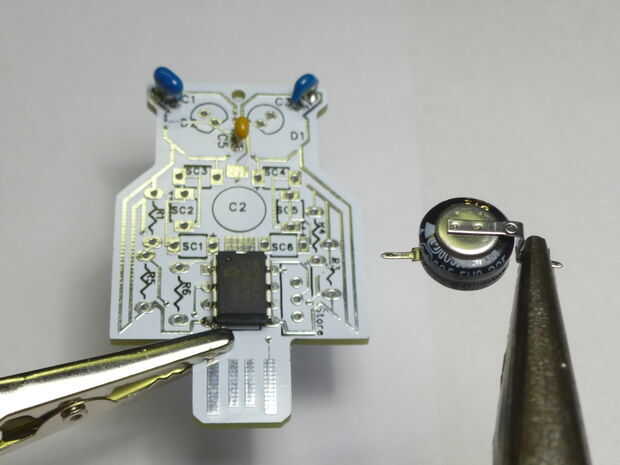 Siguiente el condensador estupendo! Este perrito mantiene su lindo Mochuelo blinky durante 90 minutos después del anochecer. La orientación en esta materia, pero nos hemos hecho super sencillo. Dependiendo de tu equipo puede tener una plata o un casquillo super negro. El fabricante suspender una plata, por lo que sustituimos el negro uno. APENAS le cabe en las revisiones de placa más vieja, pero en las nuevas revisiones va directamente a través de la Junta (con 5002 ThroughOwl en la parte posterior).