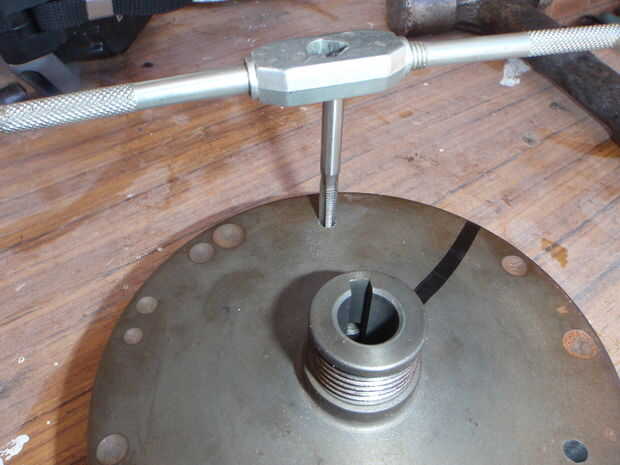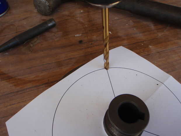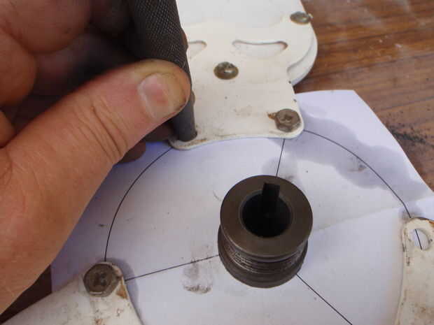 Una vez que la plantilla está en la correcta posición tres del montaje de puntos pueden ser centro de perforado y perfore con una broca de 5mm. He encontrado que el ventilador en la parte posterior del volante interfería con el taladro por lo que fue quitado. El volante es de hierro fundido y muy suave, así perforación y grabación con un tap de 6mm fue muy fácil.