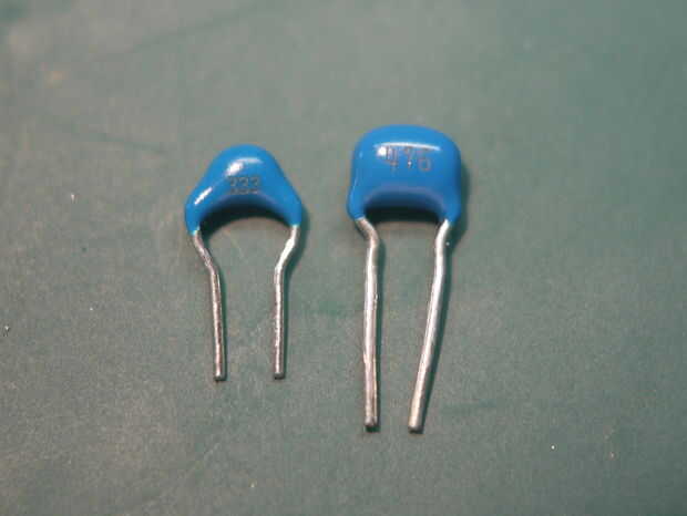 C1 es el medio de uno. Los números pequeños Lee "476". Los dos primeros dígitos son el valor, la tercera es el multiplicador. Los condensadores se miden en pico faradios. Por lo que es de 476 47 * 10 ^ 6 pico-faradios.