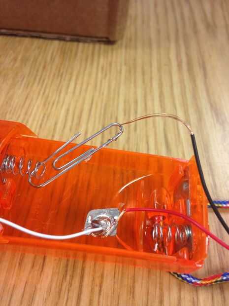 Conecte el cable negro a la final/muelle negativo de la batería. Asegúrese de adjuntar al extremo negativo que tenga contacto directo con el motor para completar el circuito. Fue difícil para la mayoría de nosotros a envolver el cable alrededor de la primavera y seguro, así que usamos un clip de metal para hacer un poco más fácil.