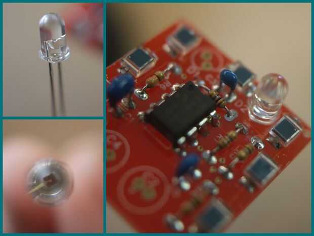Ahora para la diversión de parte, los bits blinky! D1 y D2 son lo LED blinky. También es importante que se sueldan en correctamente. Pero por suerte es fácil decir la polaridad. El círculo alrededor de sus orificios tiene un lado plano. Se alinean con el plano en el LED y tienes la polaridad correcta.