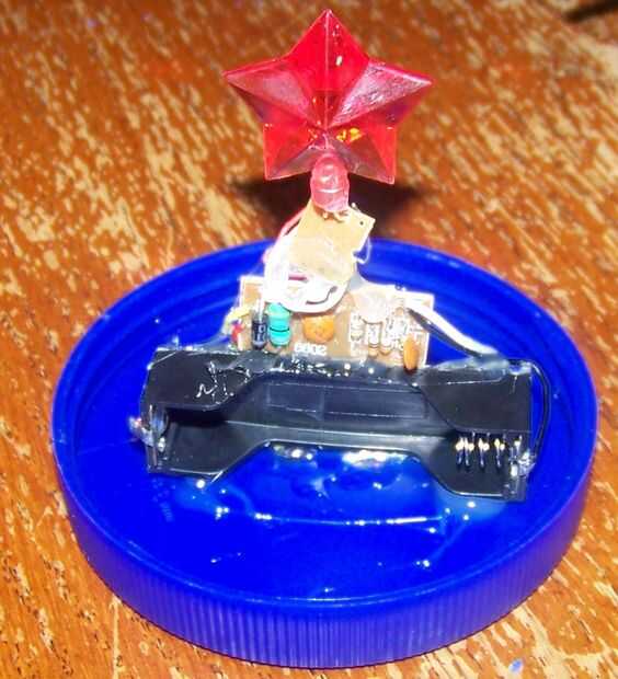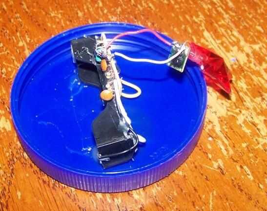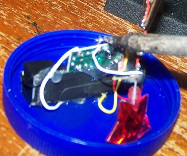 Una vez que todo fijado, poner una pila y ver si funciona correcto. Si lo hace, retire el pegamento caliente y virar todo juntos (ver la tercera foto abajo). Una vez que esté seco, poner epoxi en todas las uniones principales y deje que se seque durante la noche.