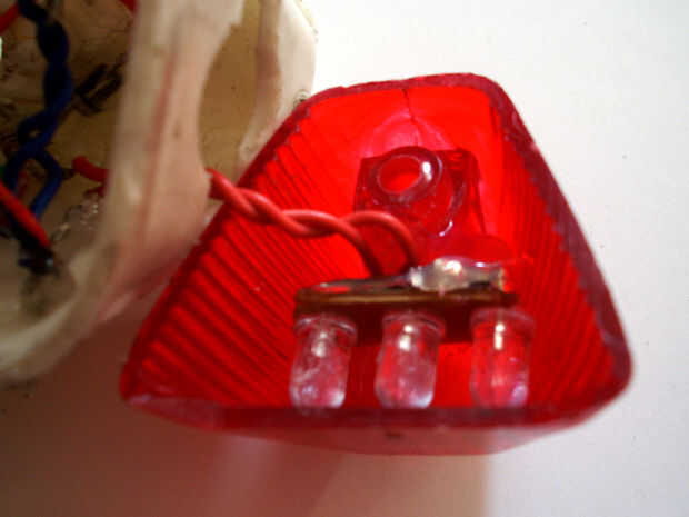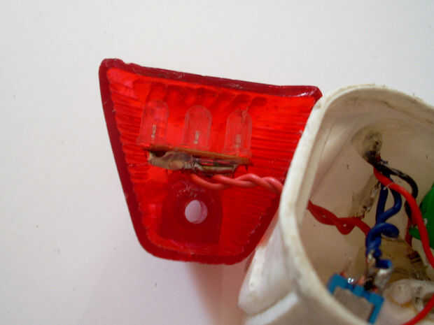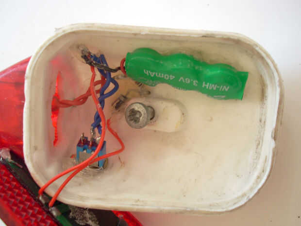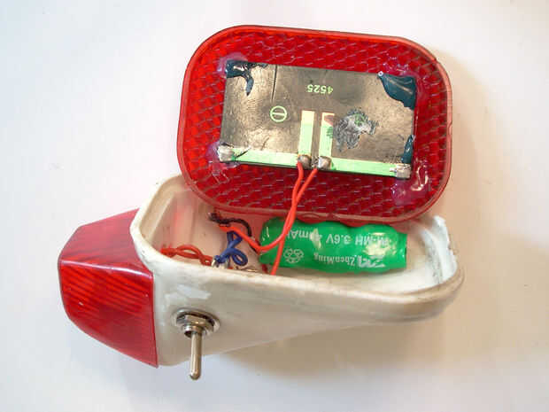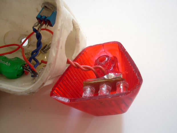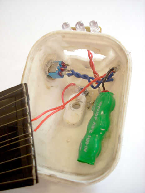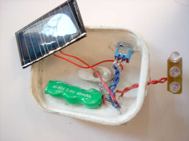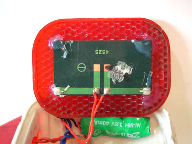 Con algún pegamento Fije la batería y otros componentes en el interior, los LEDs en la tapa transparente roja y el panel solar en el reflector. Tenga cuidado de no cubrir el lado activo del panel con el pegamento.