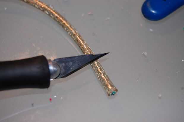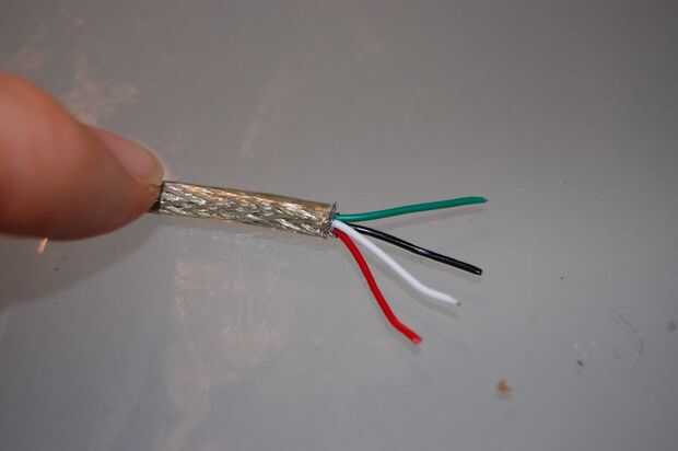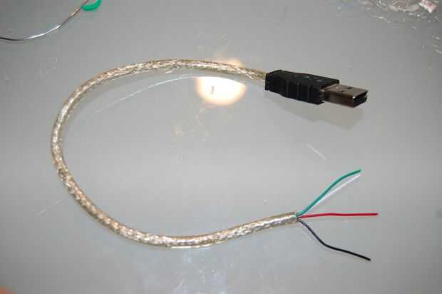 Empezar por stripping posterior 2" de la chaqueta y el blindaje de los cables USB. Ser muy, muy cuidadoso al hacer esto, porque no quieres a nick o a cortar los cables dentro. Con el blindaje quitado, debería ver cuatro cables: rojo, negro, verde y blanco. El rojo y el negro son energía, y el verde y el blanco son los datos.
