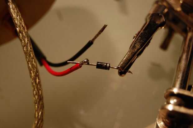 Ahora debe instalar un diodo de protección en el cable positivo que viene desde el panel solar. Cuando la flor está conectada a un puerto USB adecuado para carga o transferencia de fotografías, este diodo impide que voltaje va la manera incorrecta en el panel solar. Usted puede utilizar casi cualquier diodo normal, pero un diodo de germanio funcionará mejor porque su tensión es más baja (0.3V en vez de 0.7V) - permitiendo que el panel solar cargar el marco de foto digital en luz baja.