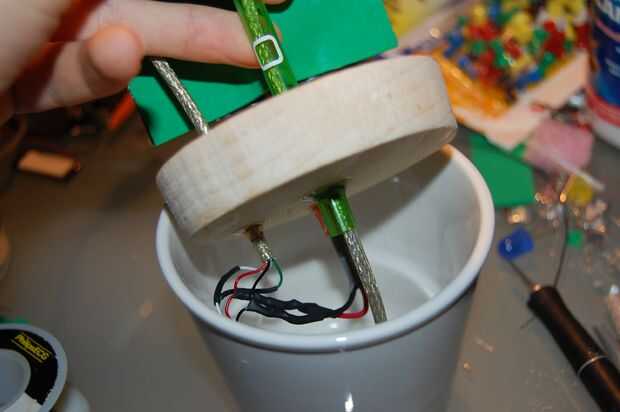 Ahora todo debe ser funcional - si tienes el panel solar hasta una fuente de luz, la pantalla debe encender y aparecerá el icono "carga". Si está satisfecho que todo está conectado correctamente, meta los cables en el bote y deslice la base de madera con flor adjunta y panel solar en el bote. Si es ajustado entonces tendrás que pegarla en. De lo contrario, poner unos puntos de pegamento caliente para mantener en su lugar.