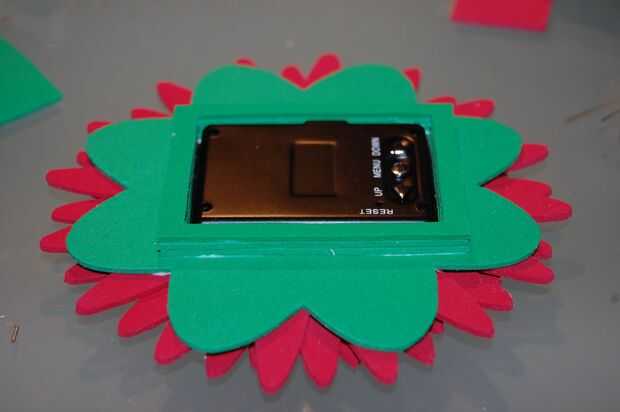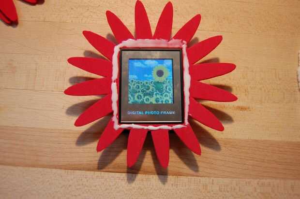 Apila para arriba como muchos de los separadores rectangulares que sean totalmente necesarios para cubren el grueso del marco digital. Necesité tres. Pegamento en su lugar y dejar de lado la flor por ahora.