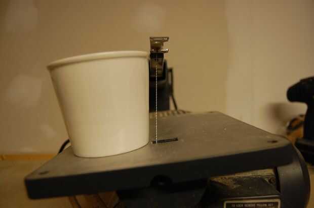 El borde de la cama de"flor" debe cortarse en un ángulo para que las cuñas en su lugar. Este ángulo se puede fijar fácilmente en la Sierra de marquetería o sierra de banda. Simplemente establece el plantador en la mesa de la sierra al lado de la hoja y ajustar el ángulo de la mesa hasta que la hoja esté paralela al borde inclinado de la sembradora.