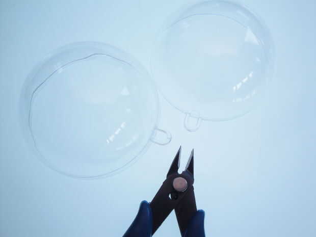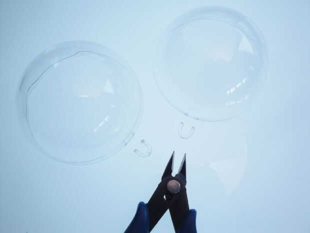 Utilice la herramienta cortando y cortar lentamente en un círculo hasta que haya quitado las pestañas. Empiece el recorte lejos y. Recortes demasiado al borde de la esfera puede crackearlo!