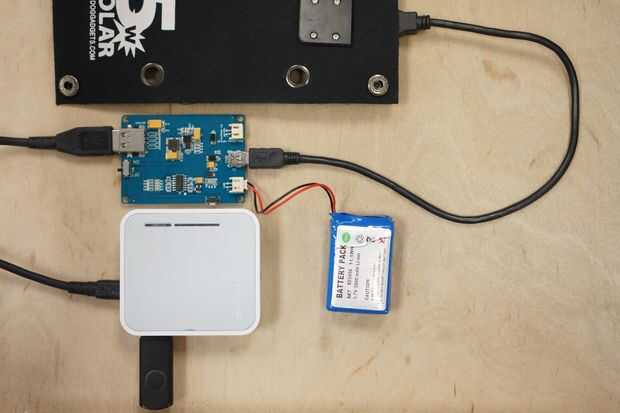 El jinete de LiPo se MR3020 directamente de la célula solar y utilice cualquier exceso de potencia para cargar la batería LiPo. Si la célula solar no está produciendo suficiente energía, el jinete de LiPo extraerá de la batería para proporcionar una fuente de 5V constante. Si usted encuentra que la PirateBox no sobrevive al intento de noche aumentar la capacidad de la batería.