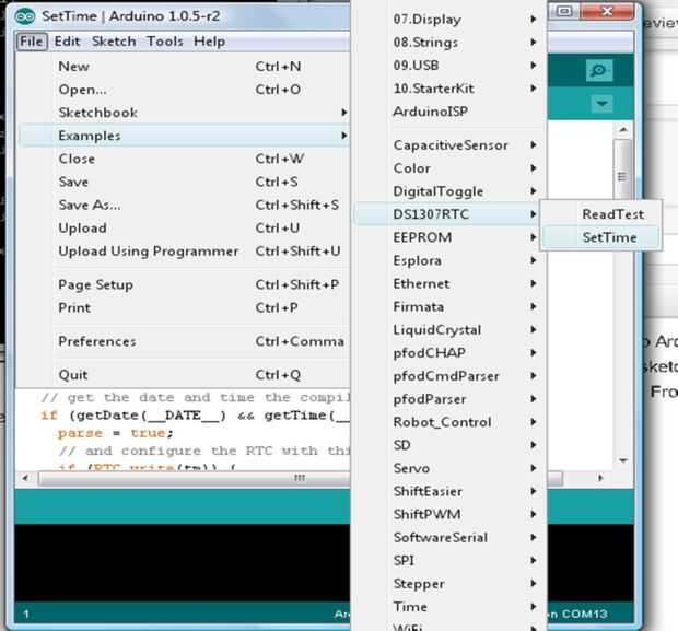Ahora es el momento para trabajar en el equipo. Descargar las librerías de tiempo y DS1307RTC. Importar las bibliotecas de Arduino IDE y luego iniciar el IDE. Luego ir a archivo < ejemplos < DS1307RTC < setTime.