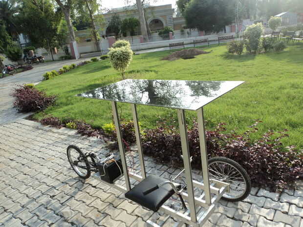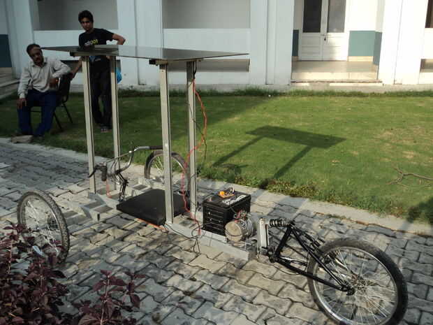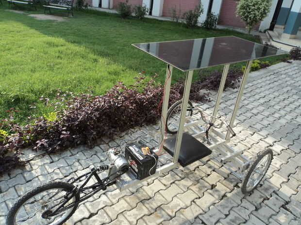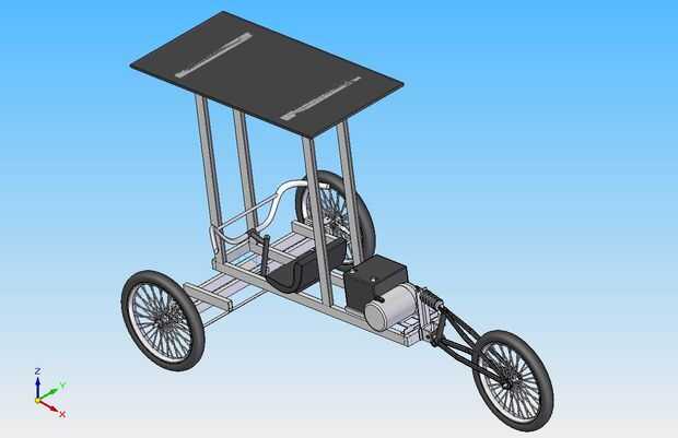 Su un vehículo que utiliza configuración de reverse trike, ruedas delanteras i-e dos y una sola rueda en la parte trasera. Manejo se realiza con la ayuda de las ruedas delanteras. También consta de un panel solar, batería y un motor de corriente continua.