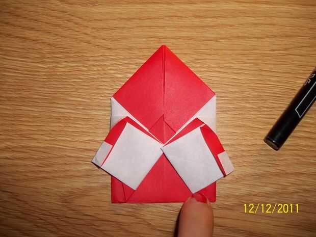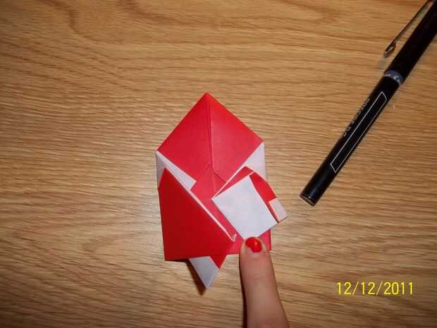 (como se muestra en el lado izquierdo) doble los bordes modo que el borde se alinee con la línea entre el rojo y blanco. (como se muestra a la derecha) siguiente doblez los extremos detrás hacia fuera y métalos bajo el triángulo blanco.