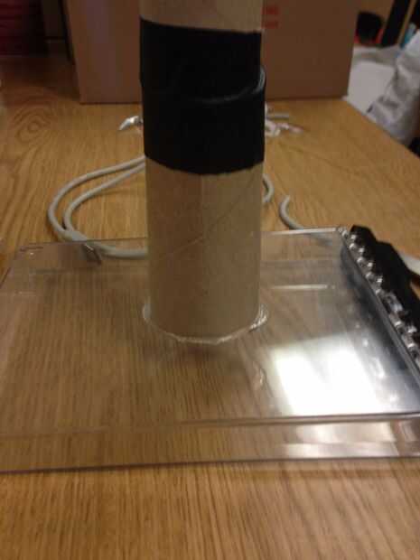 Nuestra biblioteca dejó de usar los casos de joya-lock para DVDs y nadie quiere o necesita, por lo que he guardado algunos para proyectos y futuras manualidades. Caliente se pega nuestra torre de cartón a la base de plástico resistente. Puede usar cualquier cosa que usted puede pensar, más cartón, un libro viejo, etc..
