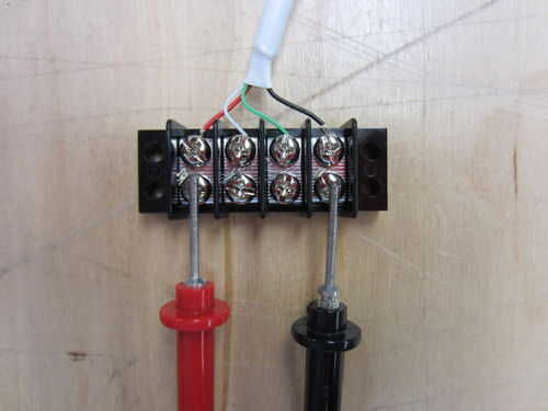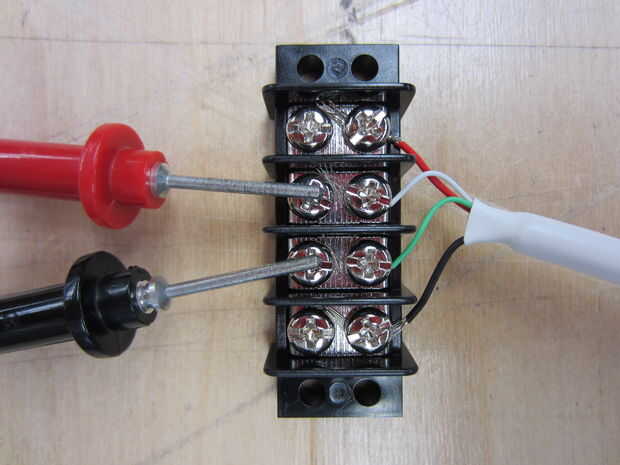 5. Conjunto el multímetro para medir resistencia y toque la prueba las puntas de prueba a los datos de dos líneas (blanco y verdes) como se muestra en la cuarta foto.  El medidor debe indicar que la resistencia de cero ohmios (es decir, conectado) como se muestra en la foto Quinta.