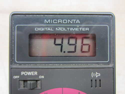 3. Con un multímetro, póngalo a prueba de voltios DC y toque las puntas de prueba para el positivo (rojo) y tierra (negro) cables como se muestra en la segunda foto.  La tensión debe leer muy cerca de 5 voltios, como se muestra en la tercera foto.