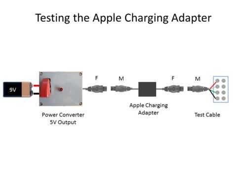- Conecte el Apple adaptador para el convertidor de corriente y el cable de prueba al Apple adaptador de carga como se muestra en el primer diagrama de carga.