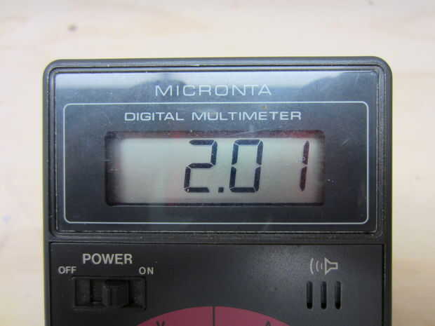 - Con un multímetro, ponerlo a prueba para voltios de DC y toque la prueba sondas a los datos de blanco plomo y plomo (negro) de la tierra como se muestra en la segunda foto. La tensión debe leer muy cerca de 2 voltios, como se muestra en la tercera foto.