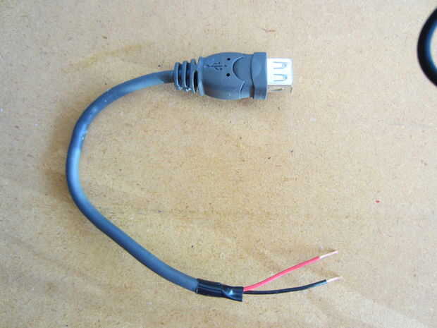 4. Corte de un conector USB tipo A hembra y tira de los extremos de la energía conduce como se muestra en la cuarta foto.  Sólo cortar las líneas de datos (cables verdes y blanco).  No se utilizará.
