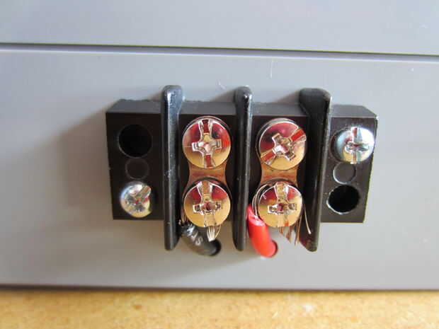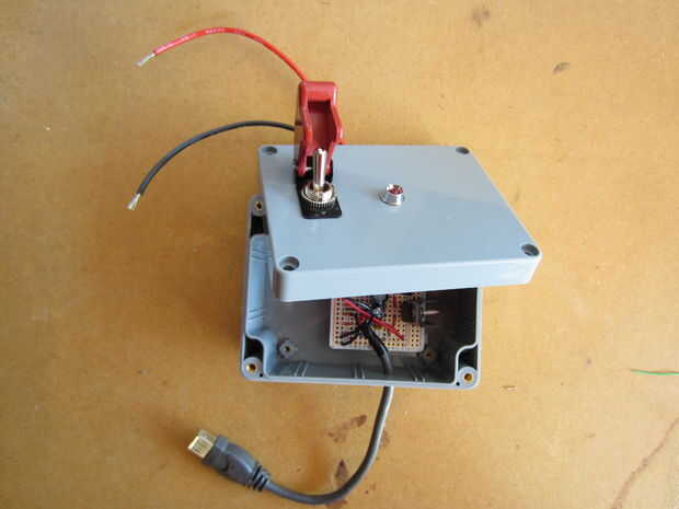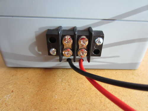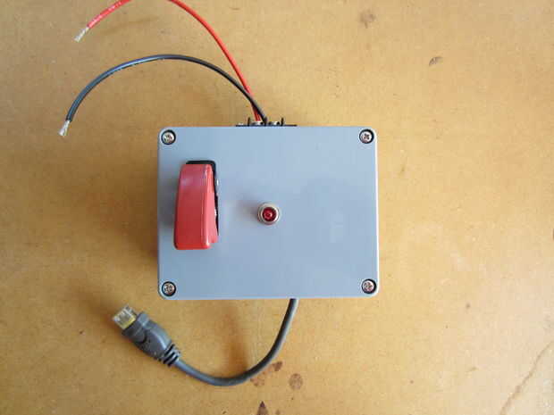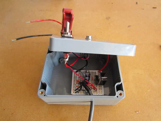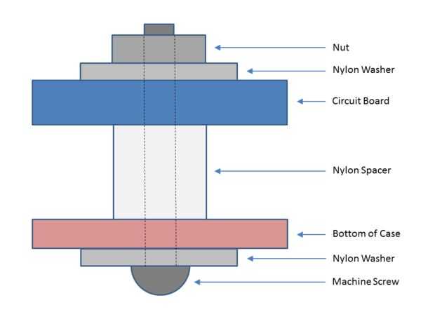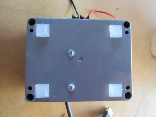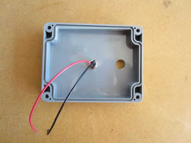 3. Deslice los cables de alimentación a través de los orificios debajo de la barrera en el lado de la caja y montar la placa de circuito en caja con los tornillos de máquina #4-40, tuercas, separadores de nylon y arandelas como se muestra en las fotos quinta y sexta.