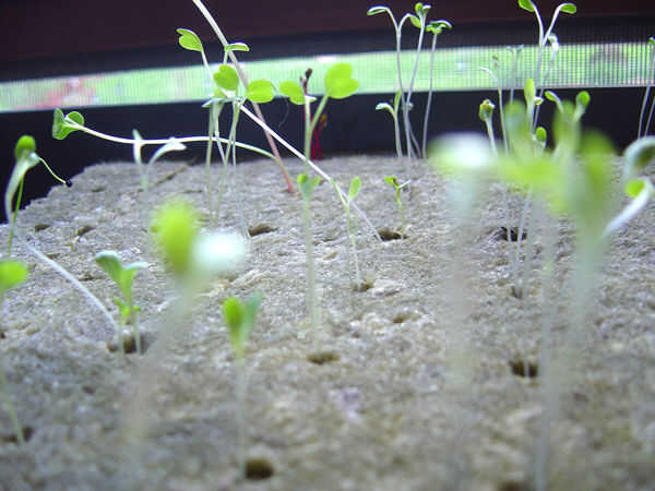 Revise la bandeja diariamente - generalmente vierta un poco de solución en la bandeja (no sobre la lana de roca) diariamente para mantener uniformemente húmedo. Si hay humedad no absorbida en la parte inferior de la bandeja de no añadir más. Ya tienes las plántulas una vez la bandeja diariamente para mantenerlos upright-ish. Una vez que son grandes y sólidas (o estás cansado de esperar) pop en la caja y pinchar en el lugar, siendo suave sobre las raíces.