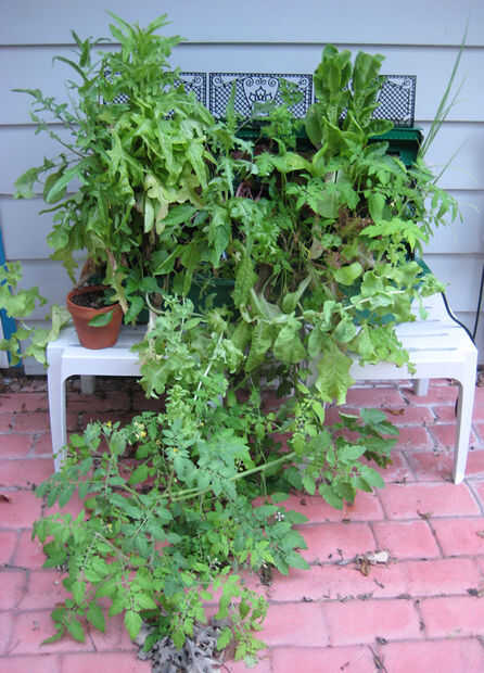 * La foto es una imagen de mediados-finales del verano, después que había comido un montón de la lechuga (fue mucho más cubierto en la parte superior) pero antes de que los tomates. Puedes ver unas flores de color amarillo bajos en la imagen. Antes de la helada golpeó allí eran un montón de tomates para comer, pero la temporada bastante decepcionante fue cortada brevemente por una serie de brutales y principios durante la noche se congela. Entonces todo fue invadido así que no podía moverme finalizó