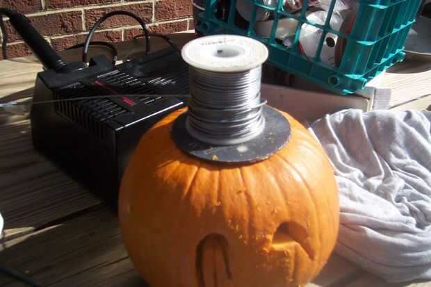 Vuelva a colocar la parte superior de la calabaza enhebrar los cables a través de la muesca. Lugar de la célula solar por lo que hace frente adelante y virar en lugar con una gota de pegamento caliente.