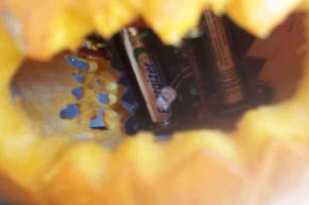 Ahora ponemos la calabaza en el porche o en un lugar donde se consigue algo de sol. Si todo ha ido bien tendrás una calabaza segura iluminada en la noche solamente.
