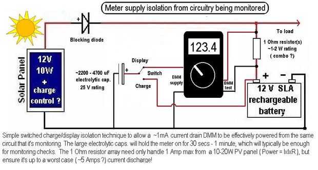 Finalmente aquí está el circuito de derivación "1 ohmio".  Otra vez se tensiona que el resistor de desviación debe ser capaz de manejar la peor descarga caso actual. Esto puede ser sólo unos pocos amperios bajo carga solar pero podría se disparan si se conectan cargas realmente resistente (incluso a corto plazo!). Un fusible o térmica viaje debe montarse si puede surgir una perspectiva. Como alternativa hacer la derivación de cromoníquel alambre de la resistencia, aunque esto probablemente necesite calibración.
