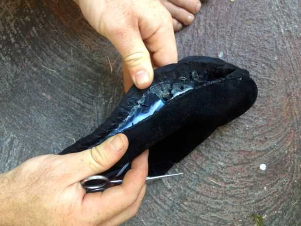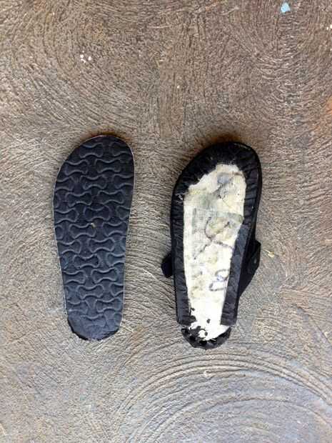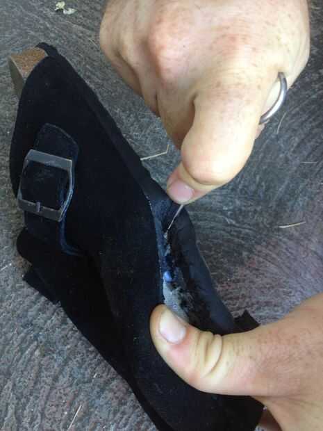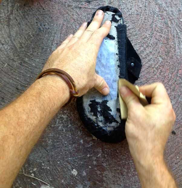 Sugerimos usar un viejo cuchillo de cocina o algo que es lo suficientemente fuerte como para bucear entre la suela y Birkenstock y aparte quitar el enlace. Una vez que eliminas la planta del pie, arena apagado cualquier parte remanente de goma pegada en el Birkenstock. Tendrá una superficie limpia para pegar la suela nueva a.