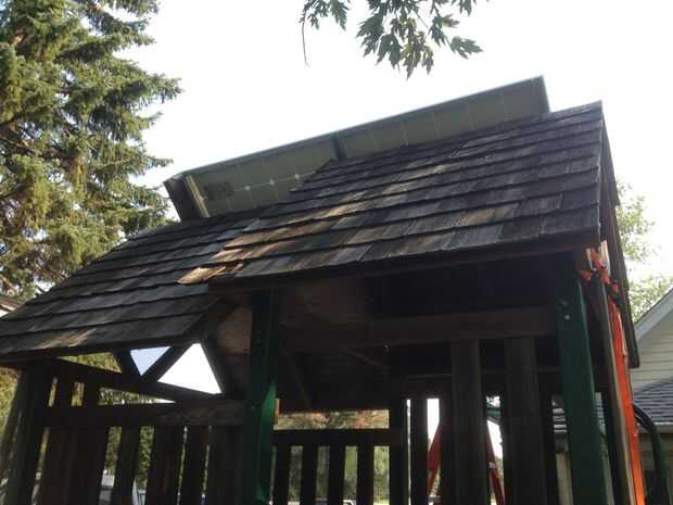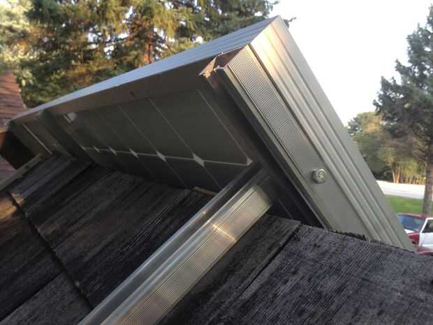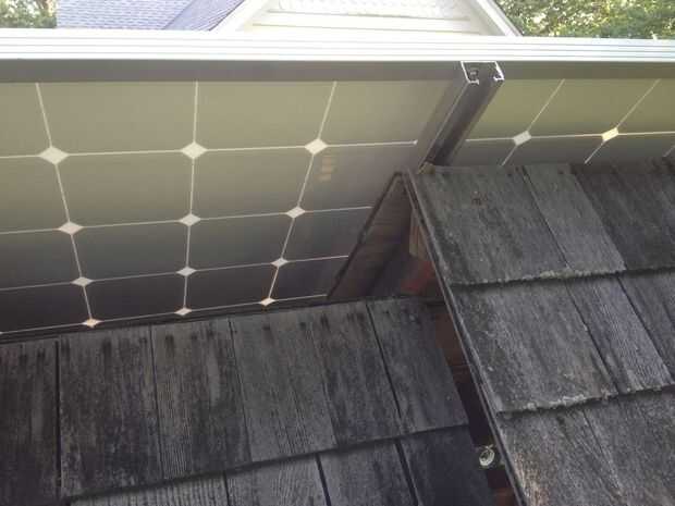 A continuación, tuve un ayudante me ayudan a levantar el panel en el techo. (¡ Gracias a Wayne!) Tuvimos a las escaleras de mano y levantó y caminó el panel hacia arriba de las escaleras. Esto era realmente más difícil conseguir el panel en el techo del juego de conjunto que habría sido para trabajar en el techo completo de un garaje o una casa. Porque el panel ocupa casi el área entera de la azotea, nadie puede estar parado en él para ayudar a fijar el panel en su lugar. Por el contrario, todo tenía que hacerse por la escalera.