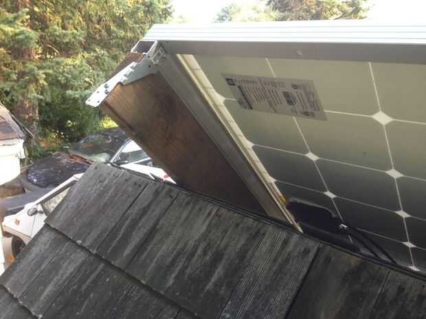 El panel fue alineados para que el apoyo del centro fue directamente sobre la viga de la final de la cubierta superior. Con él en posición, corrí un perno a través del orificio en el canal de c, a través del techo y en eso viga. El panel entonces fue nivelado (paralela al borde inferior de la cubierta) y corrí el perno de retraso para la esquina inferior izquierda. En ese momento, el grupo ya no estaba en peligro de deslizamiento y desplazamiento desde el tejado.