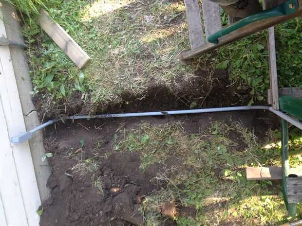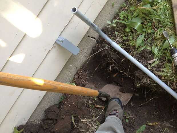 Probar montar secciones individuales del conducto, de medición y corte, luego seco-fitting codos y otros conectores hasta que tuviera el número correcto de las piezas en el orden correcto para hacer el funcionamiento de la caja en el garaje. Cavó una zanja desde el sistema del juego para el garaje y taladrar un orificio de 3/4" en el lado del garaje con una broca de pala.
