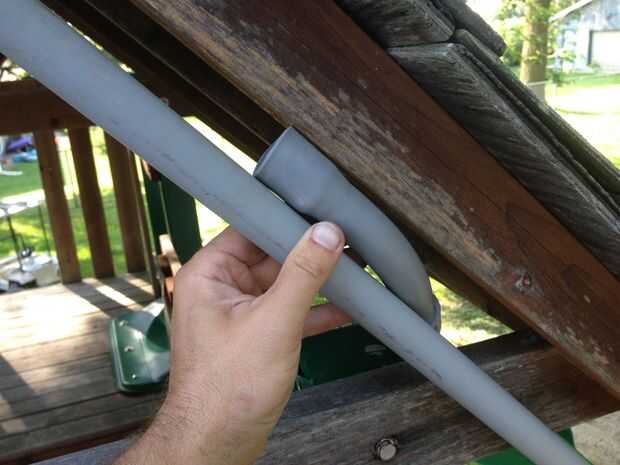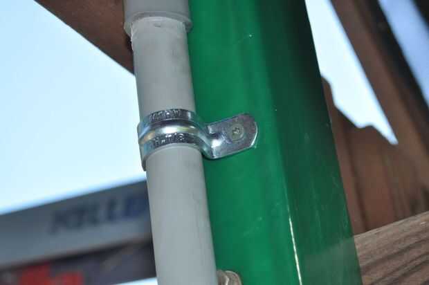 Pegué el conducto usando imprimador de PVC y cemento, simplemente siguiendo las indicaciones en las latas. Puse el conducto sobre la estructura, con un extremo va en la caja y el pico y el resto sigue en el garaje. Os adjunto el conducto a la madera con soportes de tubo de 3/4" y un tornillo de un solo piso.