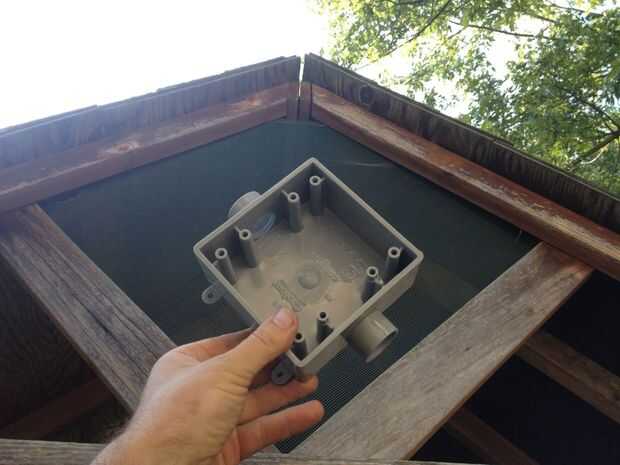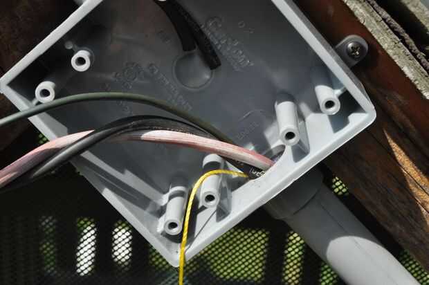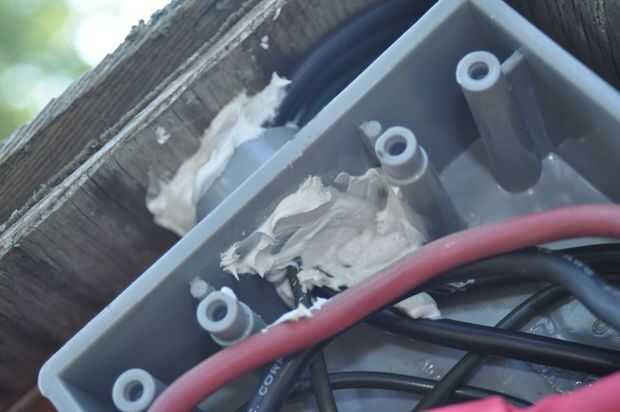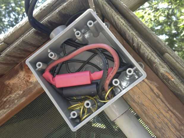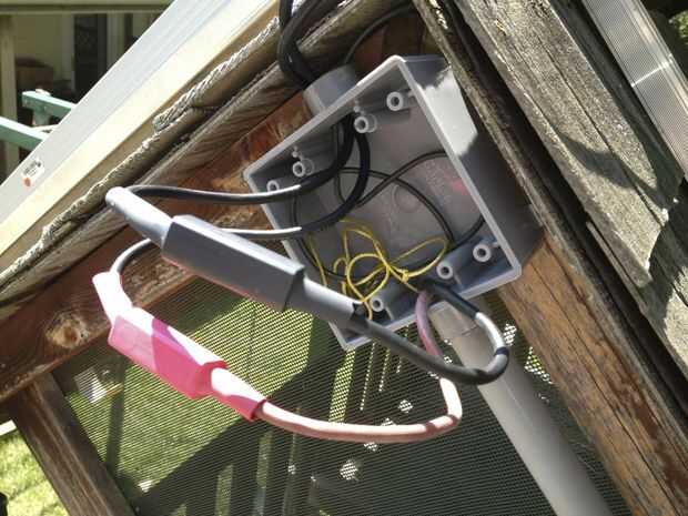 Me encontré una cinta hacia atrás a través del conducto, lubricados los cables y les echaron. Este paso es fácil de describir, pero tomó un poco de trabajo. Los cables combinados fueron realmente bastante ajustado ajuste a través del conducto. Una vez a través de los cables, cableado las conexiones en la caja en el pico de la azotea.