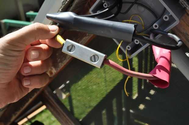 El panel solar tiene dos cables saliendo de él; un macho y una hembra conexión MC-4. He comprado un cable corto MC-4 para el propósito específico de corte por la mitad para hacer una liberación rápida entre el panel solar y caja de conexiones. En el cuadro, corrí los extremos cortados del cable MC-4, despojado de los extremos y apretar en dos bloques que empalma. Después había despojado de los extremos de los cables rojo y negro, se deslizó del abrigo del encogimiento sobre ellos y conectados a los bloques que empalma, asegurándose de que tenía mi polaridad correcta. (El rojo es positivo, negro negativo) Luego usé un intestino de calor a encogimiento del abrigo en las conexiones, aislándolos eléctricamente.