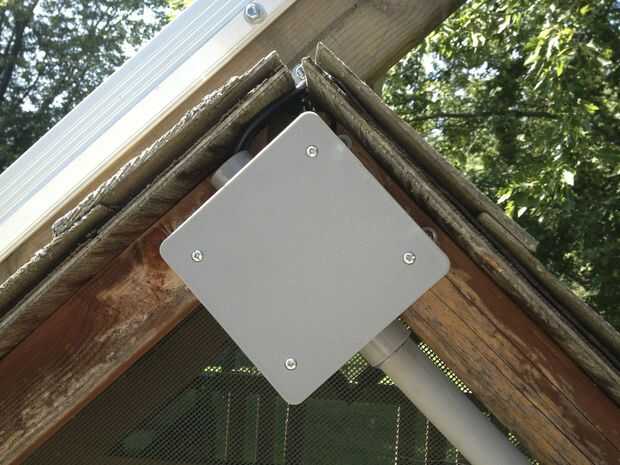 Había montado la caja cuadrada al pico oriental de la azotea. Es conveniente para llegar a allí (a través de una escalera), pero es inaccesible para cualquier persona que utilice el juego. Había montado con tornillos de acero inoxidable, con uno de los puertos hacia abajo y hacia la derecha. El puerto opuesto permite la entrada del cable solar.