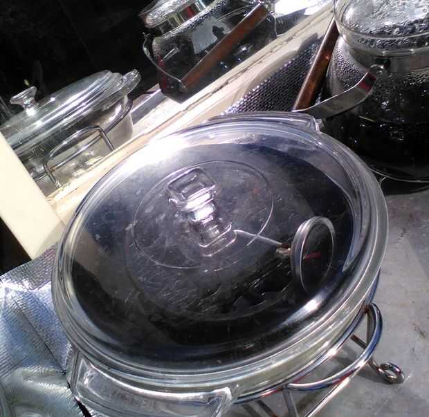 En este caso he puesto la cazuela en un soporte del pote en el área focal de espejos de 2 y un wok con papel de aluminio mylar pegado a él. El punto focal del wok es la mitad de su altura ya que es una parábola de 2 x.