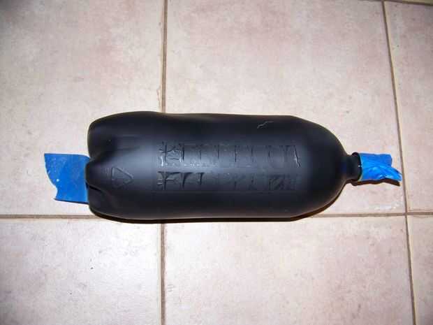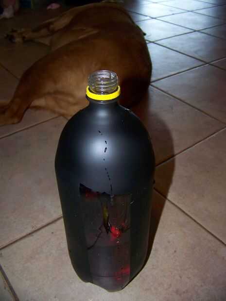 se hace de la botella de 2 litros. Envuelva las roscas con cinta y ejecutar una tira por un lado, ahora la botella del aerosol con una pintura negra para aumentar la cantidad de energía captada.