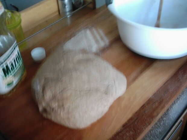 Después de que la masa ha aumentado, luego agregar 1/3 de taza de aceite y agregue 4 tazas más de harina. A continuación verterlos en un protoboard buena y empezar a amasar la masa. Será bastante pegajosa, así que espolvorear más harina por encima y debajo de la masa y seguir amasando. Seguir agregando harina hasta que la masa deja de pegarse a las manos, y pronto encontrará que la masa obtenga un seguro 'siente' que es bueno, pastosa, pero no pegajosa. Generalmente amasen la pasta durante unos 10 minutos o más, hasta que siente justo. Usted podría utilizar una mezcladora de pan con un gancho de masa, también si no quieres poner para arriba con el goo.